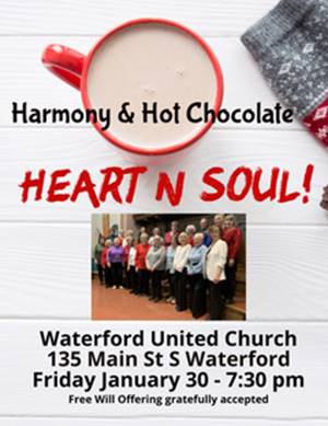 Join us for a concert and hot chocolate musical event featuring the Heart and Soul Choir on Friday, January 30 at 7:30 p.m. in the church sanctuary. Light refreshments follow.